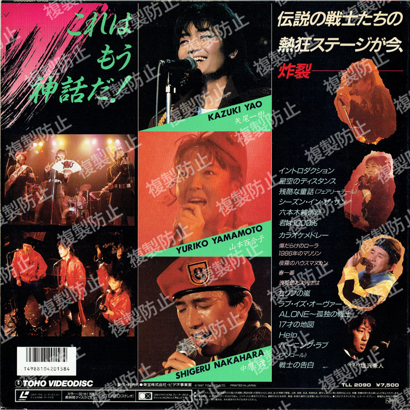 | 収録内容 | イントロダクション 星空のディスタンス 残酷な童話(フェアリー・テール) シーズン・イン・ザ・サン 六本木純情派 君は1000% カラオケメドレー 傷だらけのローラ 1986年のマリリン 夜霧のハウスマヌカン 春一番 浪花節だよ人生は セリフの嵐 ラブ・イズ・オーヴァー ALONE~孤独の戦士 17歳の地図 Help バーニング・ラブ <アンコール>戦士の告白 |