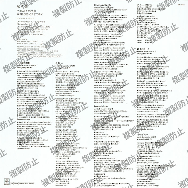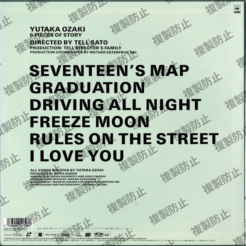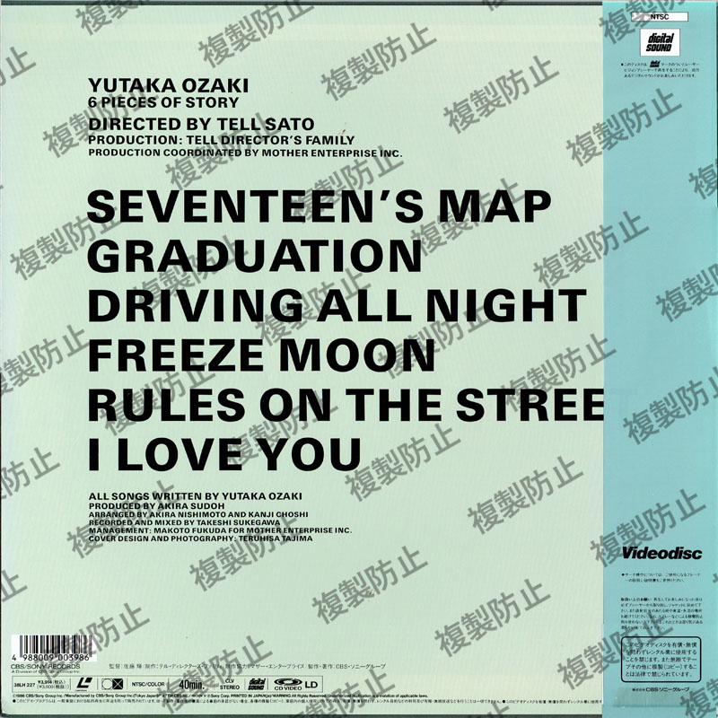| 収録内容 | YUTAKA OZAKI 6PIECES OF STORY Chapter/Track 1 . 十七歳の地図 Chapter/Track 2. 卒業 Chapter/Track 3. DRIVING ALL NIGHT Chapter/Track 4. FREEZE MOON Chapter/Track 5. 路上のルール Chapter/Track 6. I LOVE YOU |
