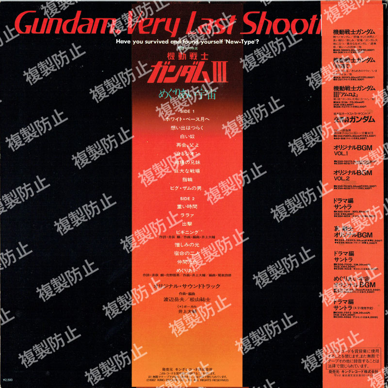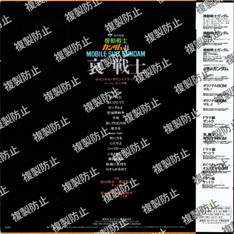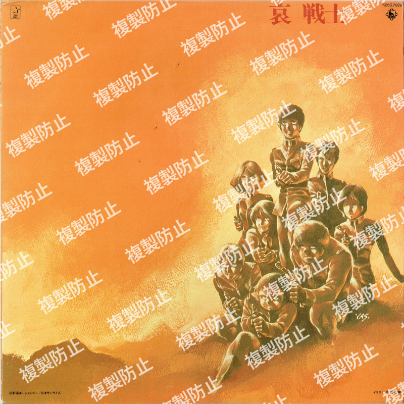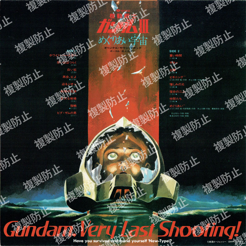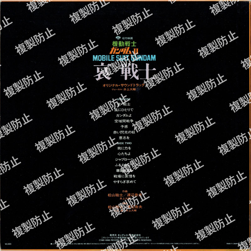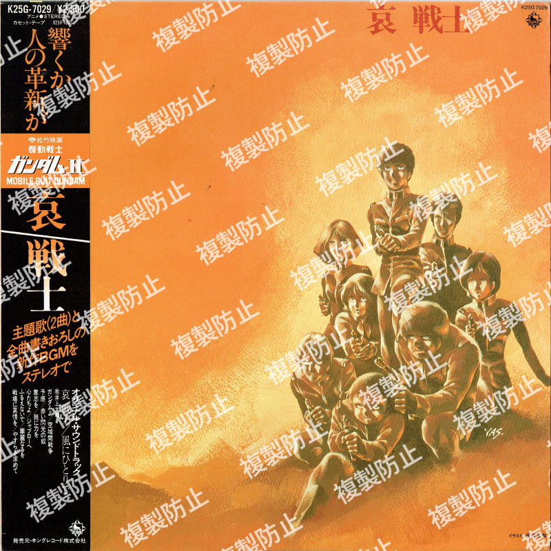 | 収録内容 | SIDE・A 1.哀 戦士 2.風にひとりで 3.ガンダムよ 4.空域間戦争 5.予感 6.赤い閃光の奴 7.意思を SIDE・B 1.我に力を 2.心たちよ 3.ジャブローへ 4.ふるえないで 5.華麗なるを 6.戦場に哀惜を 7.やすらぎ求めて ヴォーカル:井上大輔 作曲:松山祐士/渡辺岳夫/井上大輔 編曲:松山祐士/渡辺岳夫/久石譲/井上大輔 |