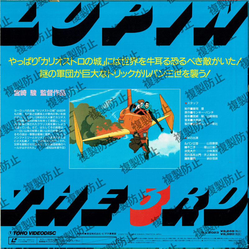 ルパン三世 カリオストロの城 アニメーションジャケット 表 2024.09.292024.10.22 ルパン三世 カリオストロの城 ジャケット 表ジャケット 裏ライナーノーツ 表ライナーノーツ 裏 長時間ディスク/CLV両面/100分カラー/NTSCモノラル 発売東宝株式会社・ビデオ事業室販売本体価格\8,980商品コードTLL 2023収録内容ルパン三世 カリオストロの城