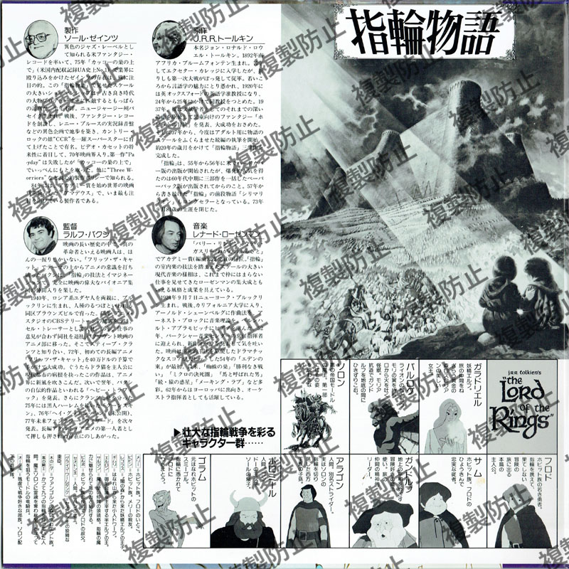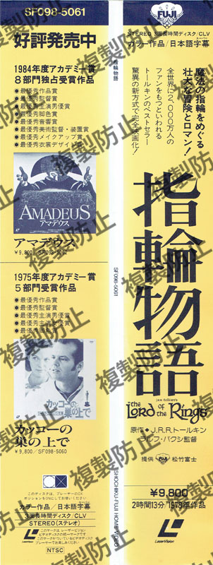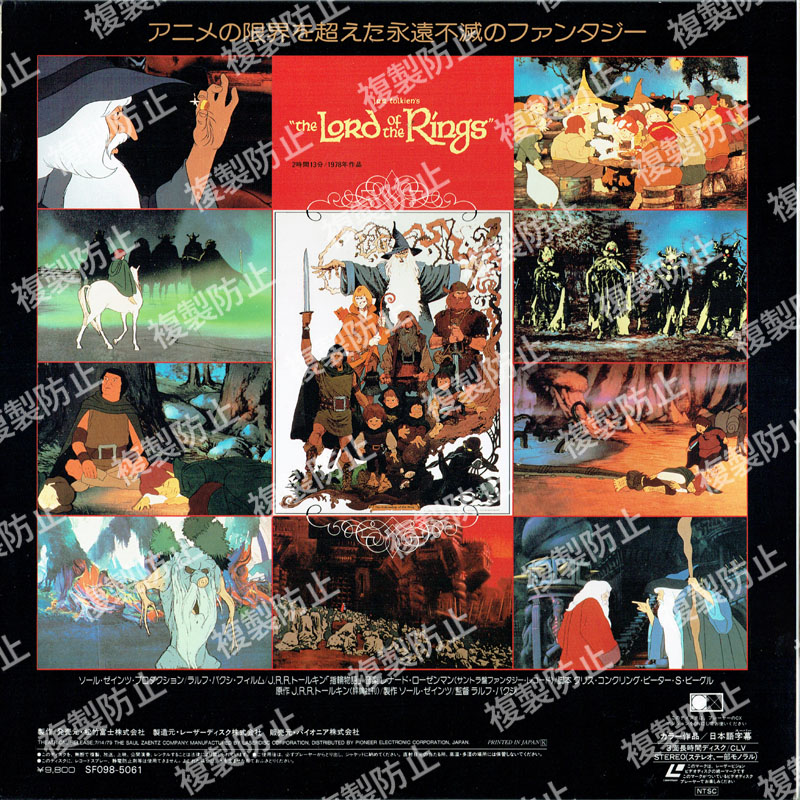 指輪物語 アニメーションジャケット 01 2024.09.292024.10.31 指輪物語 ジャケット 01ジャケット 02ジャケット 03ジャケット 04帯 長時間ディスク/CLV3面/133分カラー/NTSCステレオ(一部モノラル) 発売松竹富士株式会社販売パイオニア株式会社本体価格\9,800商品コードSFO98-5061収録内容指輪物語※チャプターなし