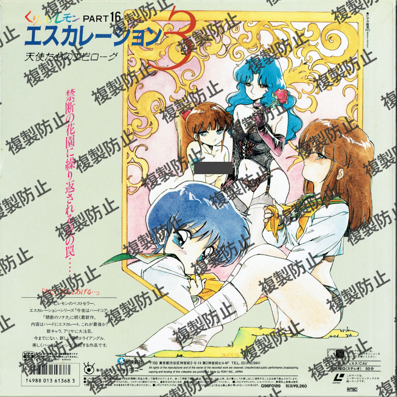 くりぃむレモン パート15・16 アニメーションジャケット 表(帯付き) 2024.10.012024.10.22 くりぃむレモン「超次元伝説ラルⅡ」「エスカレーション3」 ジャケット 表(帯付き)ジャケット 裏(帯付き)ジャケット 表(帯無し)ジャケット 裏(帯無し) 標準ディスク/CAV両面/50分カラー/NTSCステレオ 発売株式会社ポニー販売本体価格\9,260商品コードG98F0189収録内容パート1「超次元伝説ラルⅡ ラモー・ルーの逆襲」パート16「エスカレーション3 天使たちのエピローグ」