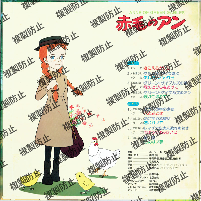 | 収録内容 | 1めん 1.(うた)きこえるかしら 2.(おはなし)マシュウ、マリラ驚く (うた)あしたはどんな日 3.(おはなし)グリーン・ゲイブルズの朝 (うた)森のとびらをあけて 4.(おはなし)グリーン・ゲイブルズのアン (うた)涙がこぼれても 2めん 1.(おはなし)ガラスの中の少女 (うた)花と花とは 2.(おはなし)おごそかな誓い (うた)忘れないで 3.(おはなし)レイチェル夫人恐れをなす (うた)ちょうちょみたいに 4.(おはなし)家路 (うた)さめない夢 |