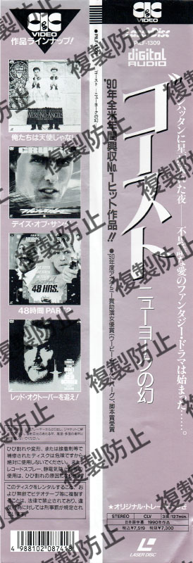 ゴースト ニューヨークの幻 レーザーディスク 2024.10.072024.10.18 ゴースト ニューヨークの幻 長時間ディスク/CLV3面/127分カラー/NTSCステレオ 発売パイオニアLDC株式会社販売本体価格\7,300商品コードPILF-1309収録内容