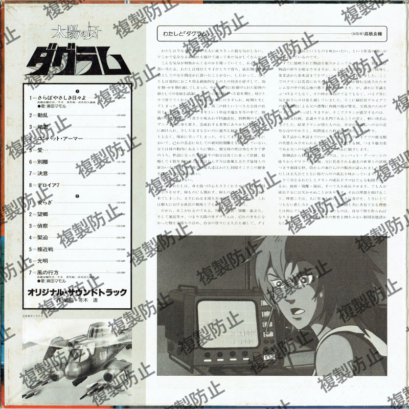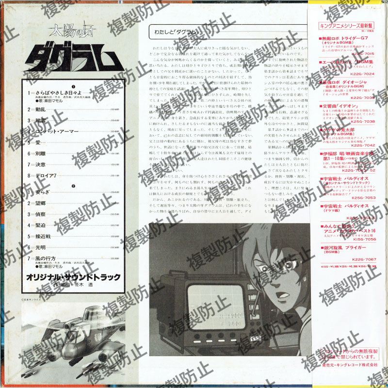 太陽の牙ダグラム アニメーション 2024.10.092024.10.22 太陽の牙ダグラム BGM集 発売キングレコード株式会社本体価格\2,200商品コードK22G-7069収録内容SIDE 11=さらばやさしき日々よ 歌:麻田マモル2=動乱3=暗雲4=コンバット・アーマー5=愛…6=別離7=決意8=デロイア7SIDE 21=安らぎ2=望郷3=偵察4=緊迫5=接近戦6 =光明7=風の行方 歌:麻田マモルオリジナル・サウンド・トラック作・編曲=冬木 透
