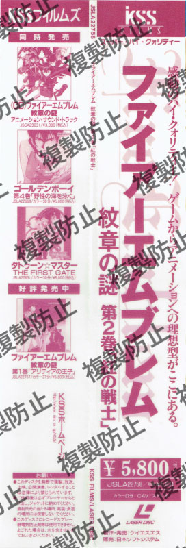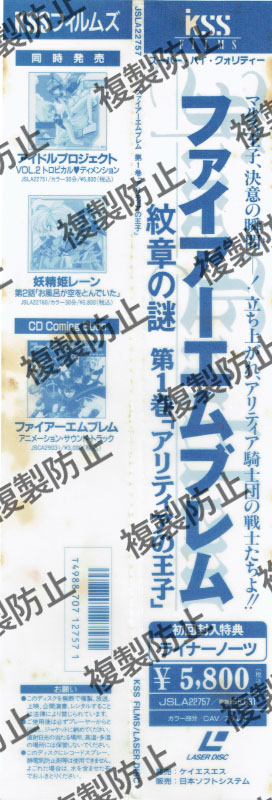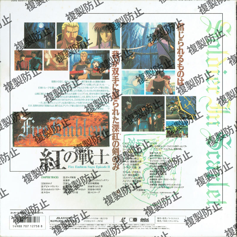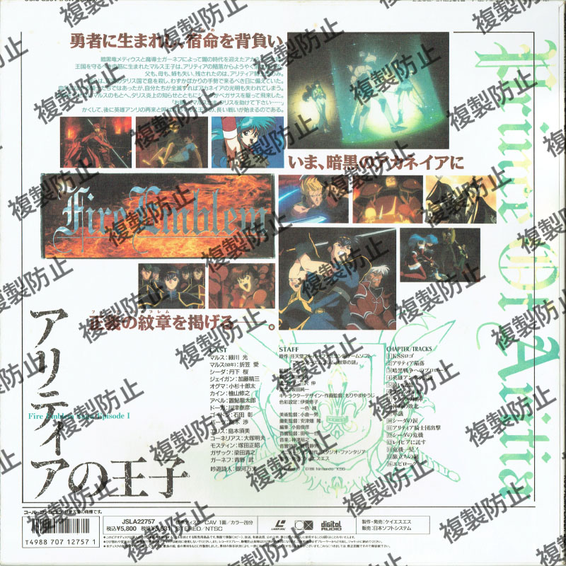 | 収録内容 | 1.KSSロゴ 2.アリティア陥落 3.暗黒戦争へのプロローグ 4英雄アンリの伝説 5.遠い記憶 6.タリスの平和 7.マルスの初陣 8.神剣の敗北 9.軍議 10.シーダの涙 11.アリティア騎士団出撃 12.シーダの危機 13.レイピアに託す 14.危機一髪! 15.旅立ちの朝 16.エピローグ |