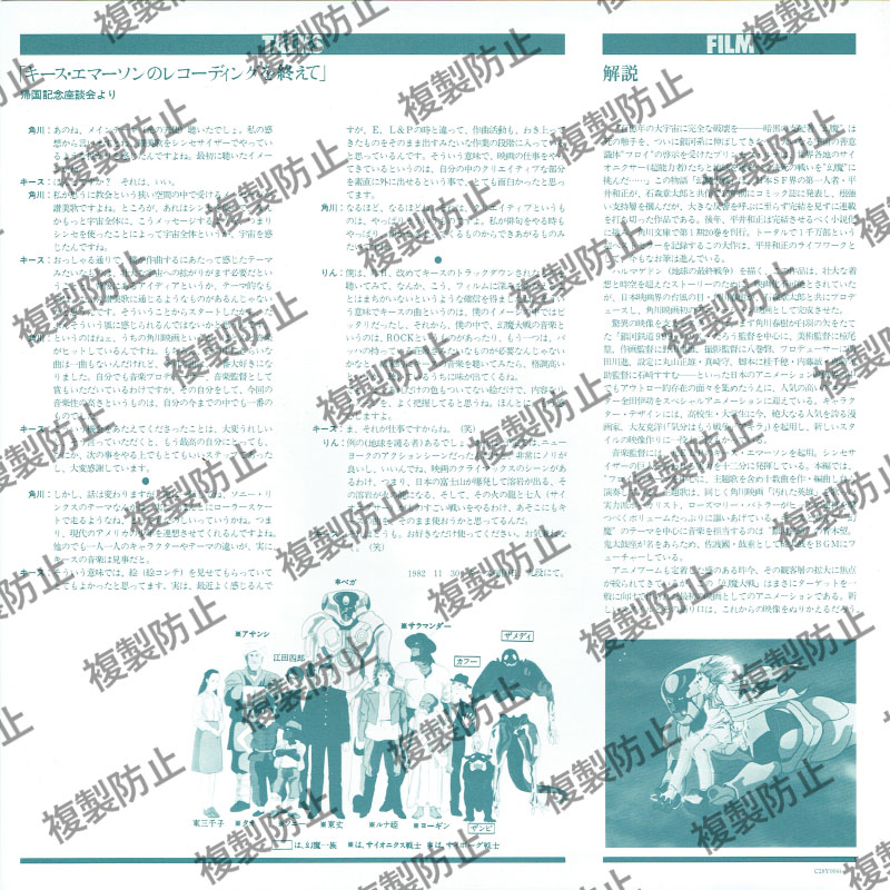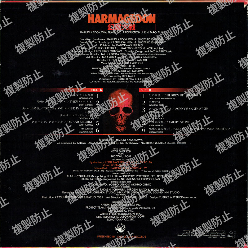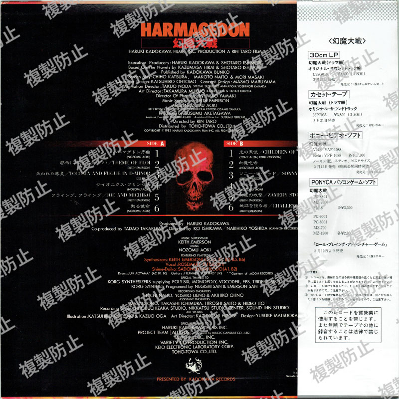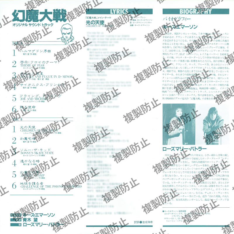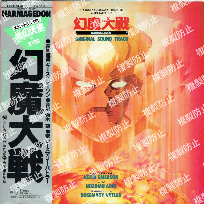 | 収録内容 | SIDE 1 1 ハルマゲドン序曲 2 啓示(フロイのテーマ)/THEME OF FLOI 3 失われた惑星/TOCCATA AND FUGUE IN D-MINOR 4 サイオニクス・プリンセス 5 フライング、フライング/JOE AND MICHIKO 6 甦る使命 SIDE 2 1 光の天使/CHILDREN OF THE LIGHT 2 幻魔咆哮 3 ソニー・ザ・キッド/SONNY’S SKATE STATE 4 遥かなる時 5 幻魔の攻撃/ZAMEDY STOMP 6 地球を護る者/CHALLENGE OF THE PSIONICS FIGHTERS ●音楽監督 キース・エマーソン ●音楽 青木 望 ●歌 ローズマリー・バトラー |