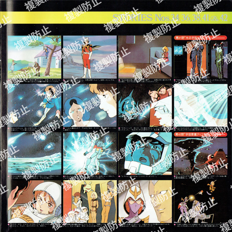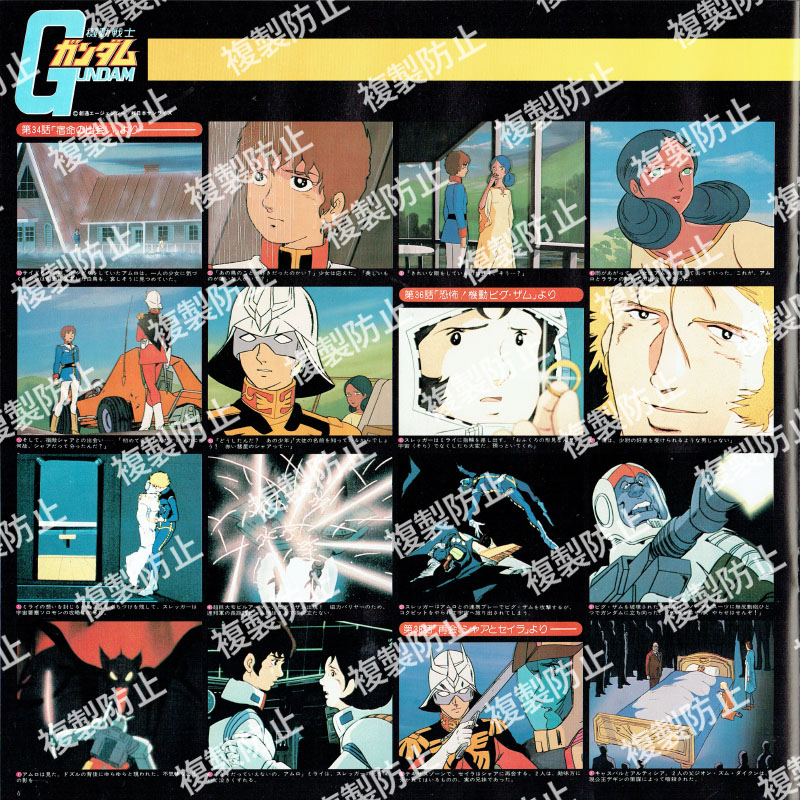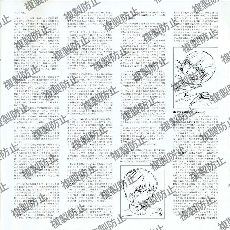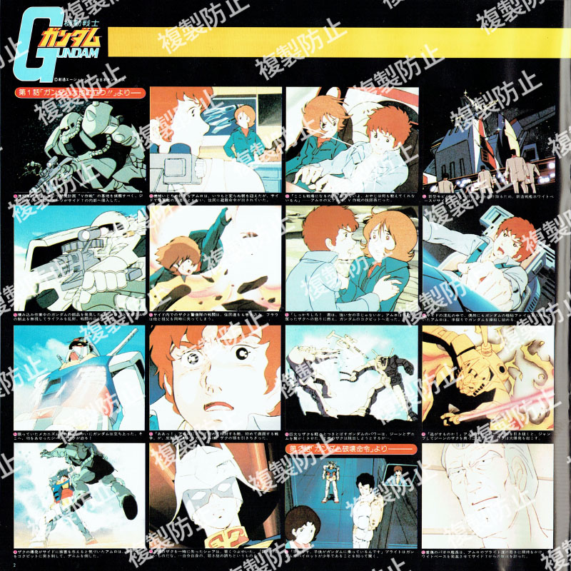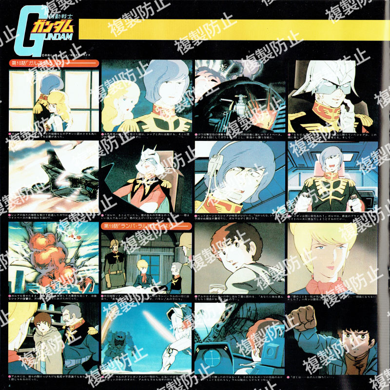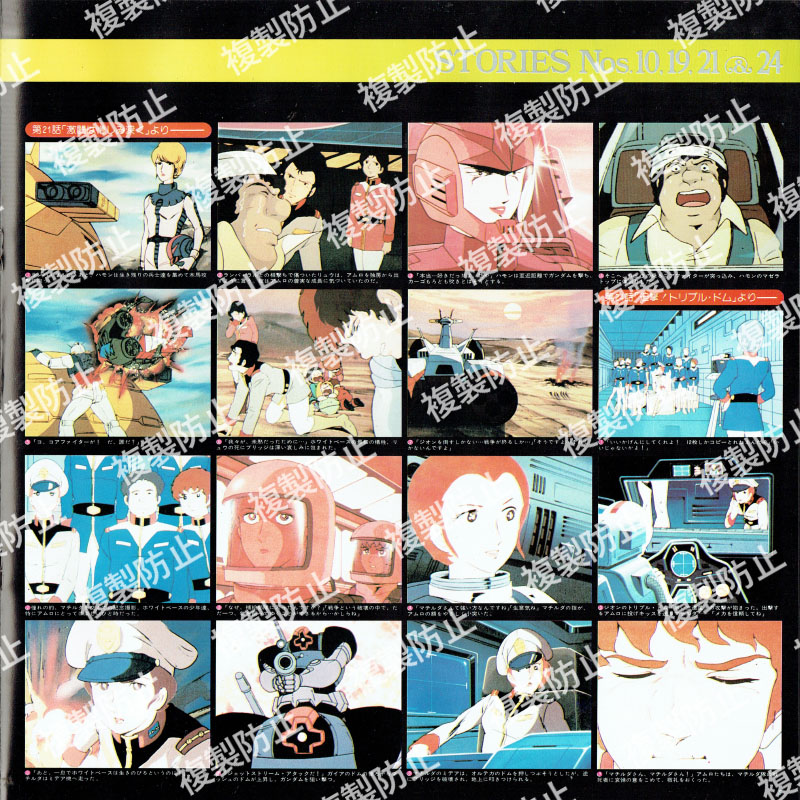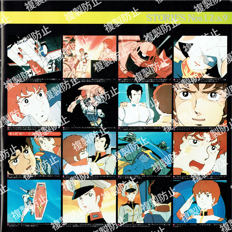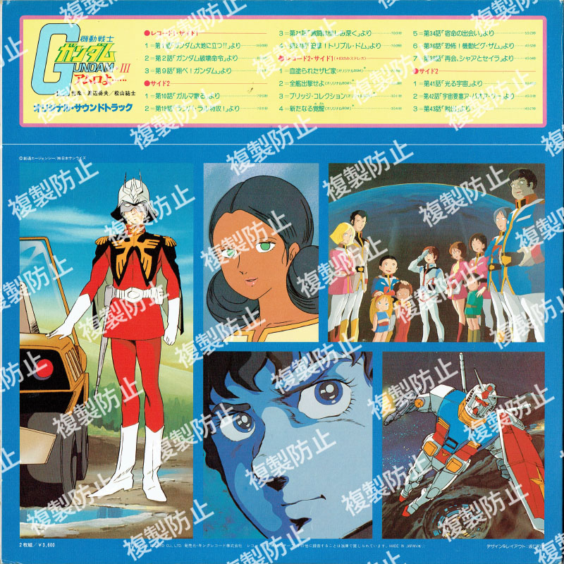 | 収録内容 | レコード1・サイド1 1 第1話「ガンダム大地に立つ!!」より 2 第2話「ガンダム破壊命令」より 3 第9話「翔べ!ガンダム」より レコード1・サイド2 1 第10話「ガルマ散る」より 2 第19話「ランバ・ラル特攻!」より 3 第21話「激闘は憎しみ深く」より 4 第24話「追撃!トリプル・ドム」より レコード2・サイド1 1 血塗られたザビ家 2 全艦出撃せよ 3 ブリッジ・コレクション 4 新たなる覚醒(めざめ) 5 第34話「宿命の出会い」より 6 第36話「恐怖!機動ビグ・ザム」より 7 第38話「再会、シャアとセイラ」より レコード2・サイド2 1 第41話「光る宇宙」より 2 第42話「宇宙要塞ア・バオア・クー」より 3 第43話「脱出」より |