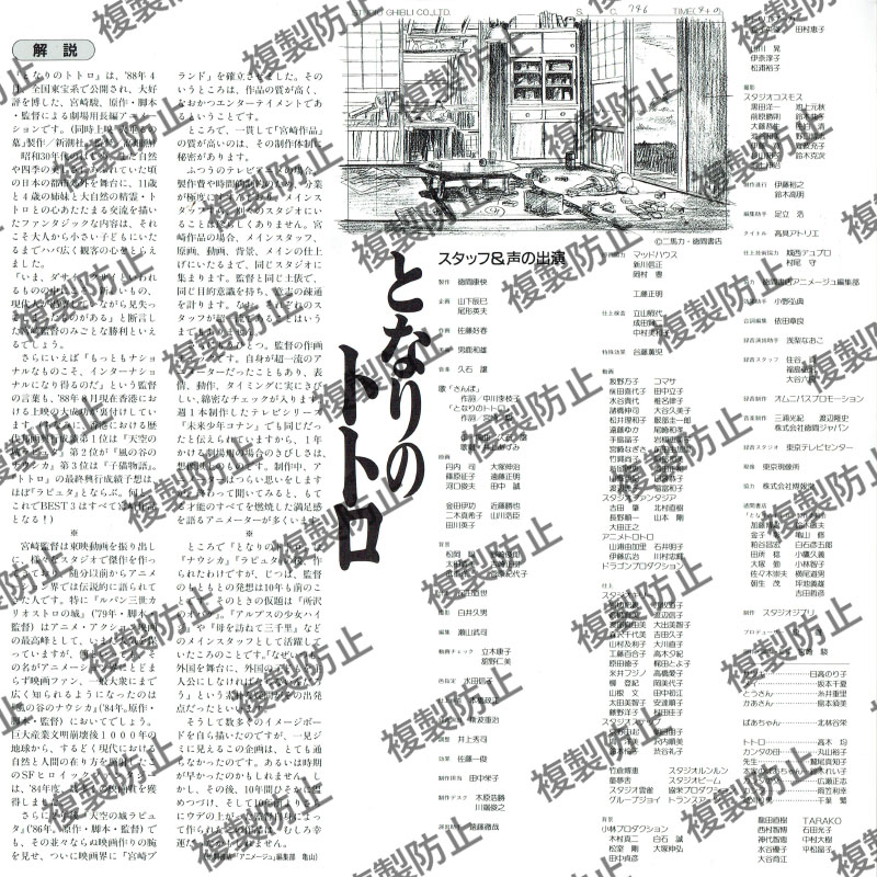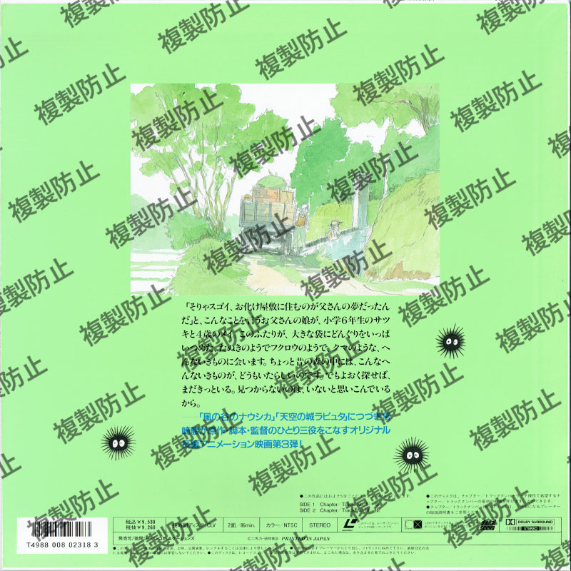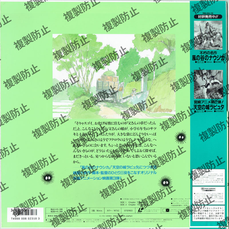 となりのトトロ アニメーション 2024.10.22 となりのトトロ 長時間ディスク/CLV2面/86分カラー/NTSCデジタルステレオ 発売徳間ジャパンコミュニケーションズ販売本体価格\9,260商品コードBELL-370収録内容この作品にはおよそ5分ごとにチャプターが入っておりますSIDE 1 Chapter/Track 1-9SIDE 2 Chapter/Track 10-18